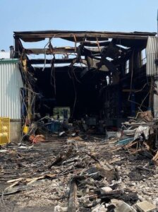 his picture shows the rear of the building looking into the plant from what was the autoclave room. The damage to the roof that runs through the center of the main building can also be clearly seen in this picture.